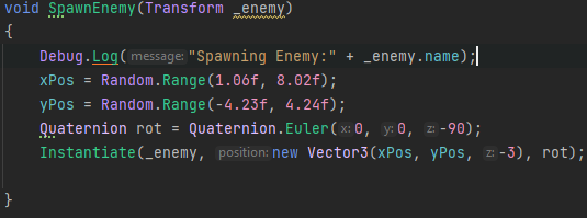 Here it spawns the enemy i use a Random Range so that they will spawn randomly in the given positions and between those positions it will spawn the enemy. As you can see i use Quaternion the reason for this is that the enemy rotates to the right rotation grade. because if i didn't use it, it was going all over the place and because of Quaternion it is in the right rotation.